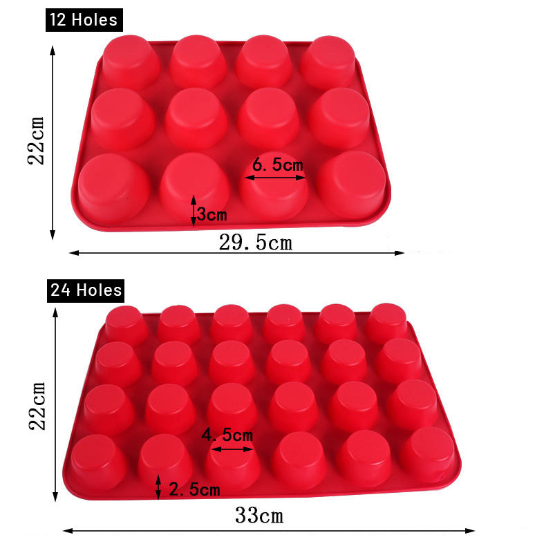 Cetakan Silikon 12 Lubang dan 24 Lubang adalah cetakan untuk membuat cupcake, muffin, kue bulat lainnya. Bahan BPA Free Food Grade, dapat digunakan pada mesin oven maupun microwave. Aman digunakan antara suhu -30 hingga 230 derajat C.