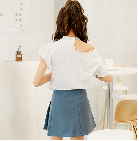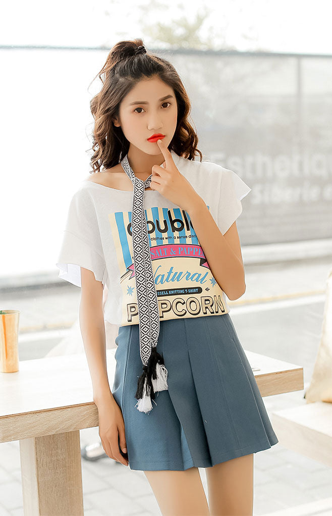 Kaos Wanita Popcorn Bahu Asimetris Pita Leher Fashion